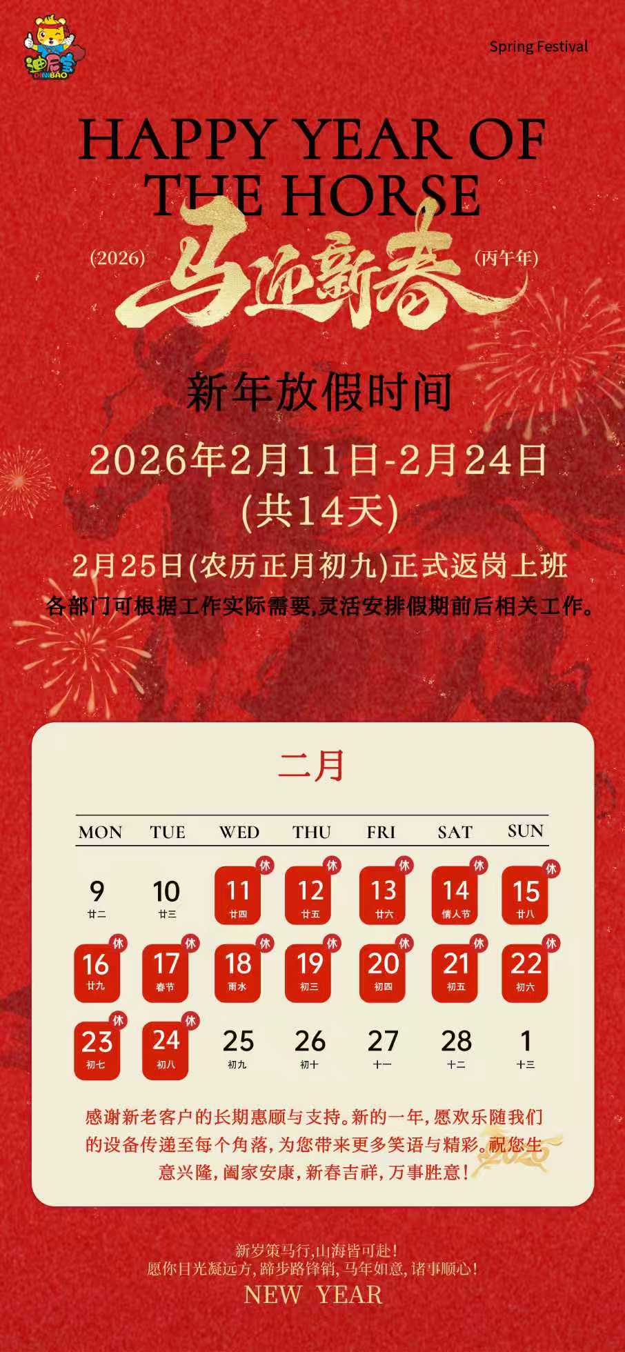 借此2026年新春佳节来临之际,根据《国务院办公厅公布2026年春节放假安排》,并结合公司实际运营情况,